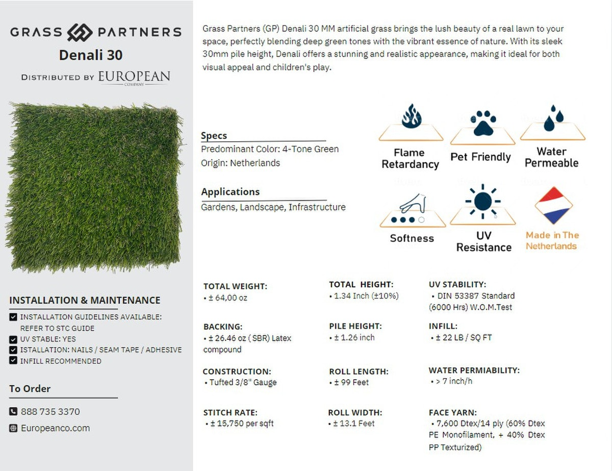 Grass Partners (GP) Denali 30 MM artificial grass brings the lush beauty of a real lawn to your space, perfectly blending deep green tones with the vibrant essence of nature. With its sleek 30mm pile height, Denali offers a stunning and realistic appearance, making it ideal for both visual appeal and children's play.