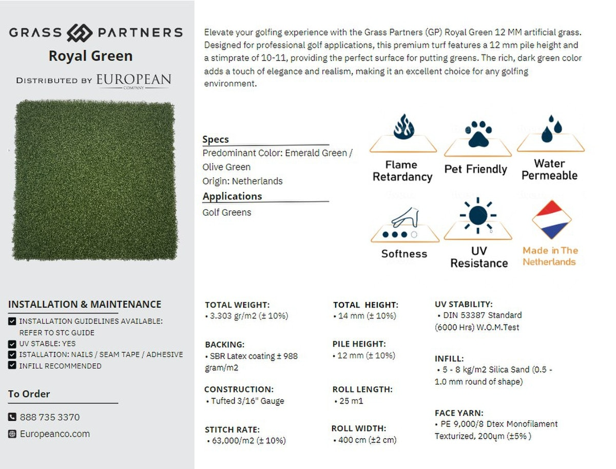 Elevate your golfing experience with the Grass Partners (GP) Royal Green 12 MM artificial grass. Designed for professional golf applications, this premium turf features a 12 mm pile height and a stimprate of 10-11, providing the perfect surface for putting greens. The rich, dark green color adds a touch of elegance and realism, making it an excellent choice for any golfing environment.