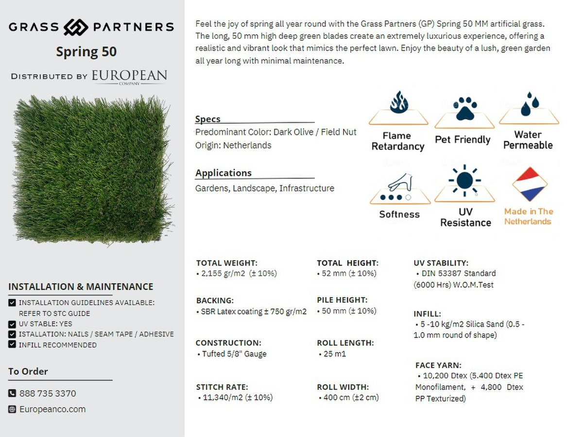 • Optimal Performance: Featuring a tuft gauge of 5/8", 18 stitches per 0.33 ft., and 11,340 stitches per square foot, the Spring 50 MM turf offers a dense and uniform texture.
