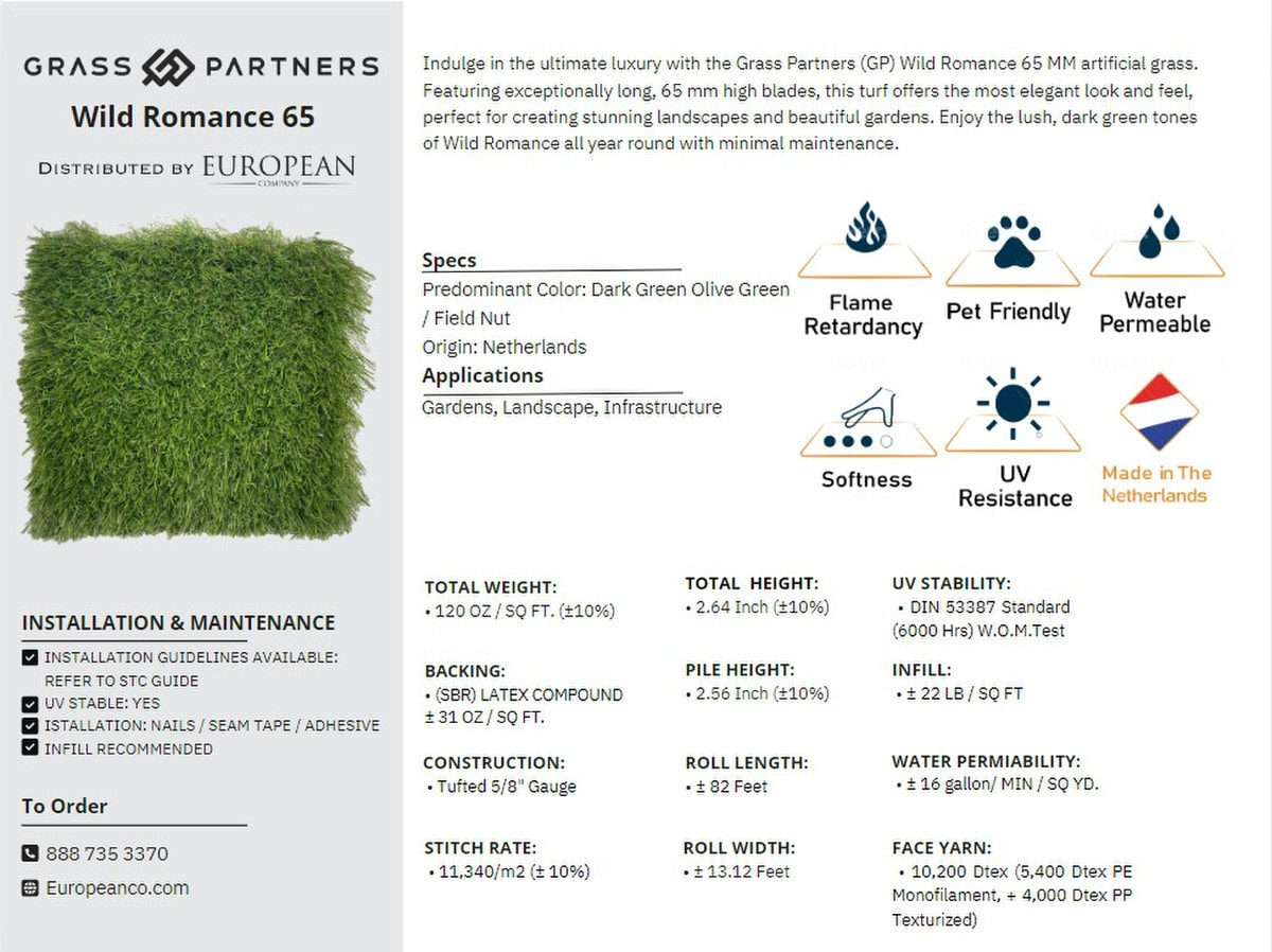 • Optimal Performance: Featuring a tuft gauge of 3/8", 18 stitches per 0.33 ft., and 11,340 stitches per square foot, the Wild Romance 65 MM turf offers a dense and uniform texture. The infill silica sand (0.5-1.0 mm) ensures optimal performance and durability, with an approximate infill weight of 22 lb per square foot.