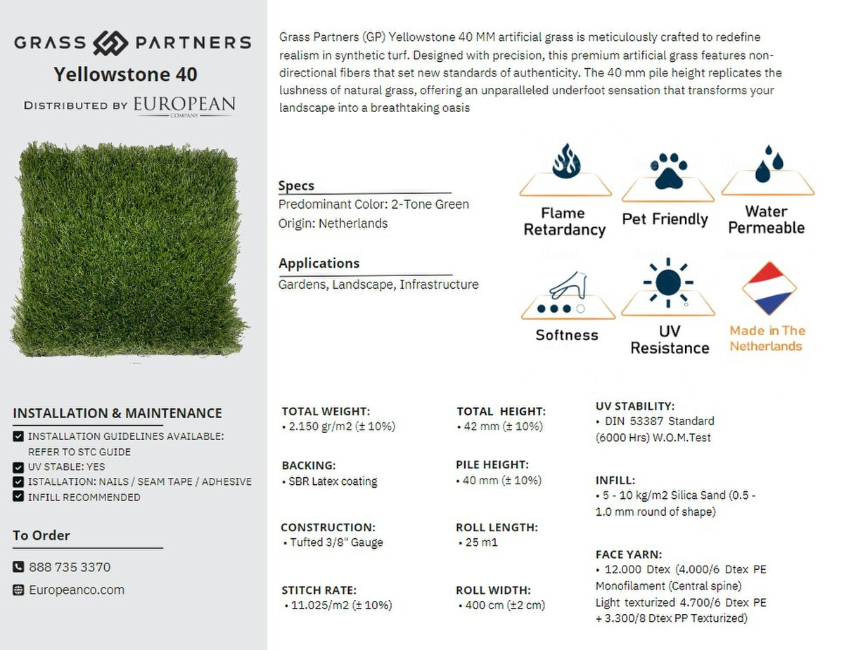 Grass Partners (GP) Yellowstone 40 MM artificial grass is meticulously crafted to redefine realism in synthetic turf. Designed with precision, this premium artificial grass features non-directional fibers that set new standards of authenticity. The 40 mm pile height replicates the lushness of natural grass, offering an unparalleled underfoot sensation that transforms your landscape into a breathtaking oasis